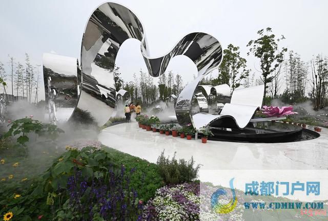 成都展园内,镜面不锈钢搭建成的山形艺术造型好似一朵盛开的芙蓉花,并置入了十二月花神文化脉络,设计构思以花为媒,通过多元造景手法,传承创新花文化特色,充分融合生态、人文、科技、艺术,满足市民的参与性、互动性。